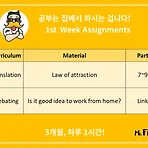 Weekly Schedule Video Assignments ● 총 녹음 파일 갯수: 4개● 블로그 댓글 개수: 1개 01. TranslationStep1. Reading English script loud. 연습 영상 시험 영상 ● 녹음 파일 1, 제출 Step2. Speaking from Korean to English ● 녹음 파일 2, 제출 02. CompositionComposition Material ● Writing 블로그 댓글 작성 ● 녹음 파일 3: 영어 스크립트 녹음 ● 녹음 파일 4: 한->영 스크립트 번역 녹음 주말 과제는 2개이며 마감 기한은 다음주 월요일 오전 8시입니다:)작문에 대한 피드백은 수요일 오전 8시 전으로 달립니다.