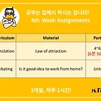 Weekly Schedule Correction Linkhttp://mrfluency.tistory.com/268 Assignments ● 총 과제 개수 = 3개 (댓글 1개+ 녹음 파일 2개) 01. Re-Writing● Writing 본 블로그 댓글 작성 02. Reading English Script ● 녹음 파일 1 전송 03. Speaking English seeing Korean ● 녹음 파일 2 전송