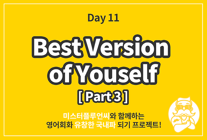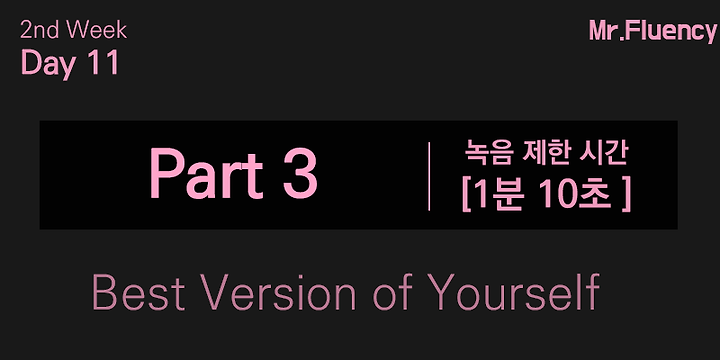 온라인 영어회화 스터디/미스터플루언씨 3기 Day11_Best Version of Yourself_Part 3 미스터플루언씨 2018. 7. 19. 10:27 Weekly SchedulePart 3 VideoAssignmentStep1. Speak Loud 3 time● 녹음 파일 1 제출Step2. Speak from Korean to English● 녹음 파일 2 제출Step3. Writing● 녹음 파일 3 제출Reminder1. 마감 시간 = 내일 오전 7시59분, 기간 초과시 출첵 처리X