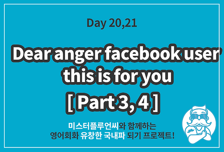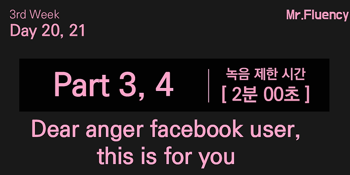 온라인 영어회화 스터디/미스터플루언씨 4기 Day 20, 21_Dear anger facebook user, this is for you_Part 3,4 미스터플루언씨 2018. 9. 1. 02:29 Weekly SchedulePart 3.4 VideoAssignmentsStep1. Speaking Loud 3 times● 녹음 파일 1 제출Step2. Speaking from Korean to English● 녹음 파일 2 제출Step3. Writing & Correcting● 녹음 파일 3 제출