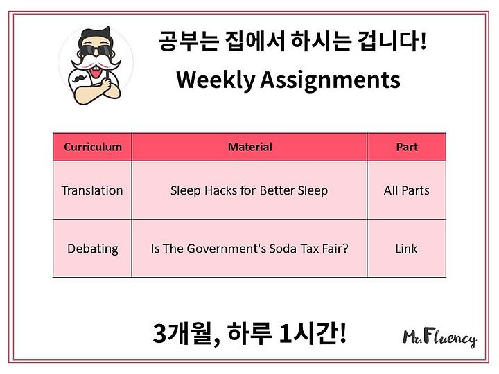 오프라인 영어회화 스터디/진행 [목요일 7-9 종로 영어회화] 2nd assignment, September. 미스터플루언씨 2018. 9. 7. 19:13 디베이팅 아티클http://mrfluency.tistory.com/169?category=798048