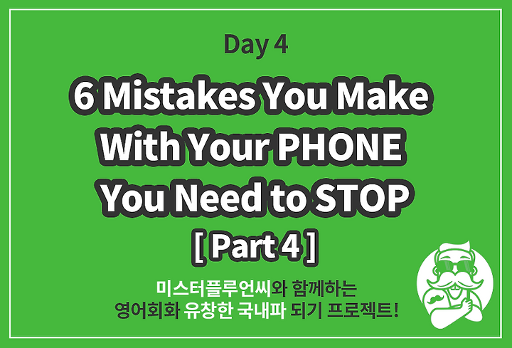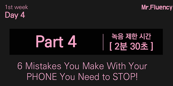 온라인 영어회화 스터디/미스터플루언씨 5기 Day 4_온라인 영어회화 미스터플루언씨_5기 미스터플루언씨 2018. 10. 4. 07:00 Weekly SchedulePart 4 VideoAssignmentsStep1. Reading English script loud.시험 영상● 녹음 파일 1 제출Step2. Speaking from Korean to English제한 시간시험 영상● 녹음 파일 2 제출