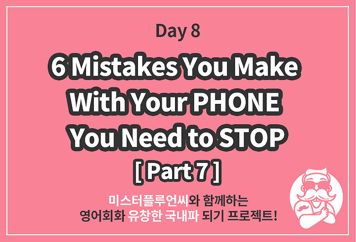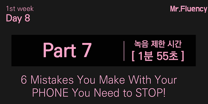 온라인 영어회화 스터디/미스터플루언씨 5기 Day 8_온라인 영어회화 미스터플루언씨_5기 미스터플루언씨 2018. 10. 8. 08:02 Weekly ScheduleDay 12부터는 새로운 자료로 공부합니다:)Part 7 VideoTranslation_AssignmentsStep1. Reading English script loud.시험 영상● 녹음 파일 1 제출Step2. Speaking from Korean to English제한 시간시험 영상● 녹음 파일 2 제출