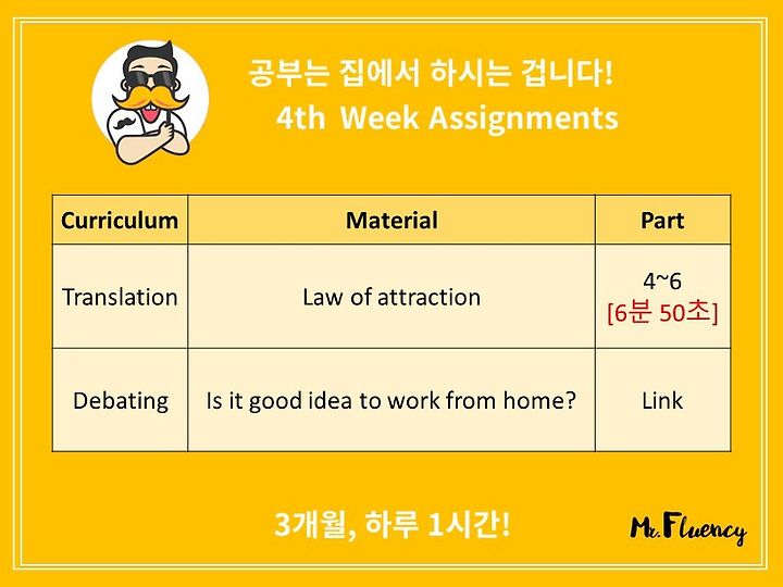 오프라인 영어회화 스터디/진행 토요일 12-2 종로 영어회화 스터디_4th assignment, November. 미스터플루언씨 2018. 11. 20. 21:35 ▶ Debating Linkhttp://mrfluency.tistory.com/251?category=798048미션: 지문에 있는 키워드 및 접속사 녹여 써오기.